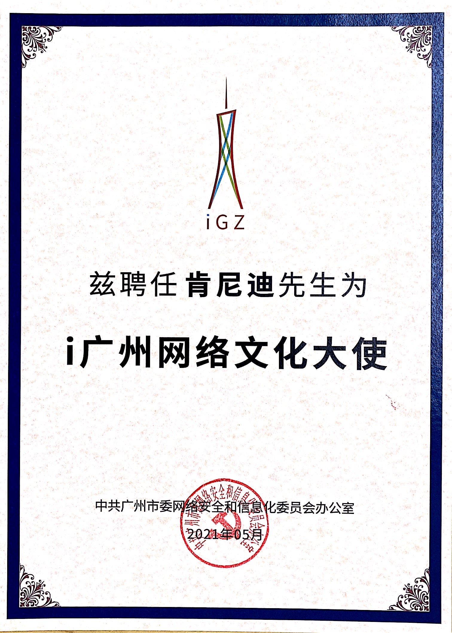 2021年5月,肯尼迪被中共廣州市委網信辦授予“i廣州網絡文化大使”,向全世界講述廣州故事、傳播嶺南文化風采,用網絡傳遞美好。