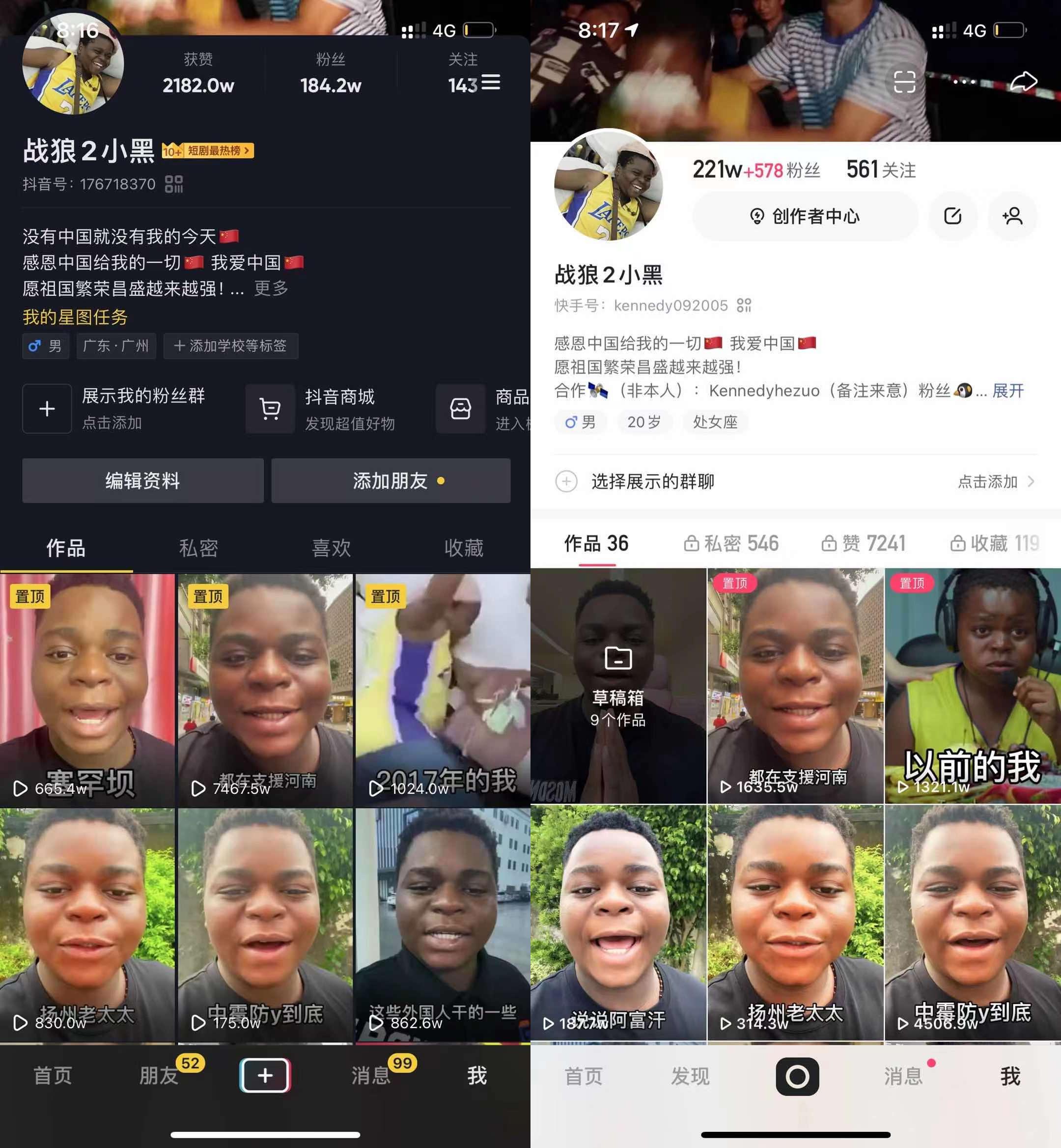 肯尼迪的另一個身份就是一個網紅主播,在抖音和快手平臺分別有180萬和220萬粉絲。近期肯尼迪拍的幾條反映中國抗疫、中國奧運健兒以及河南暴雨救援的視頻均獲得全網網友點贊,多次登上各大平臺熱搜榜,點贊量破百萬、視頻播放量破億。